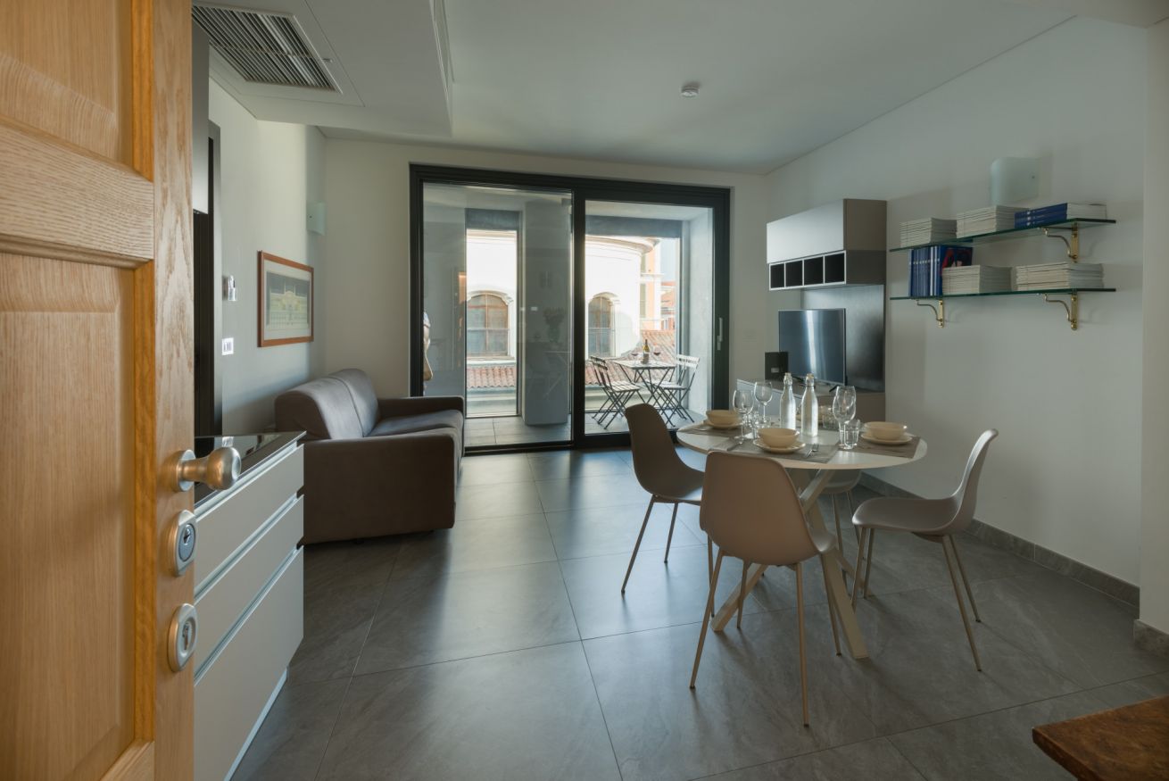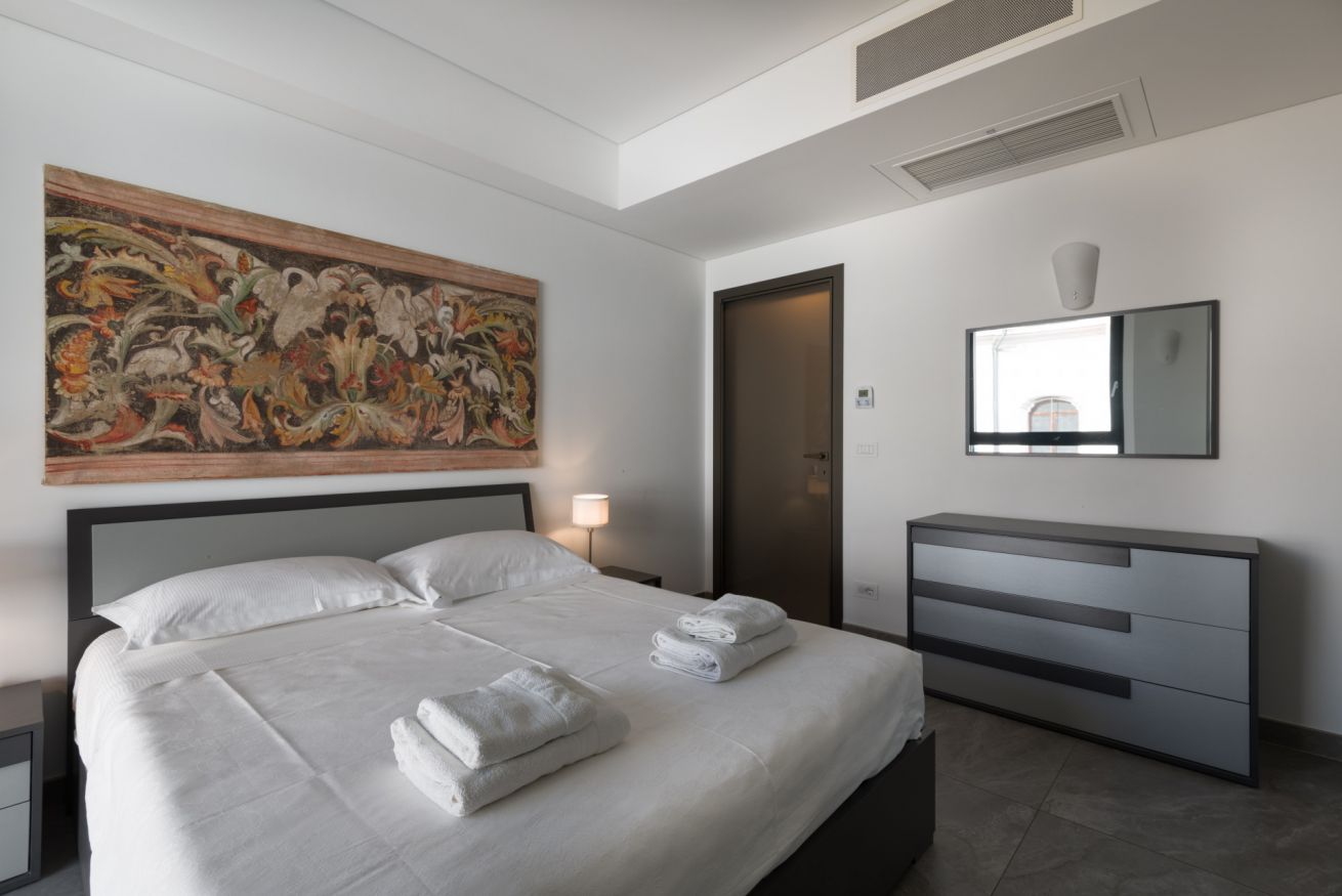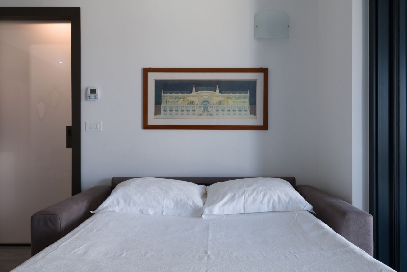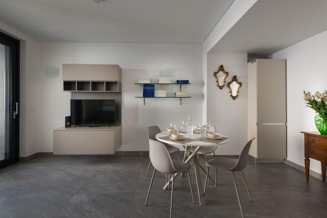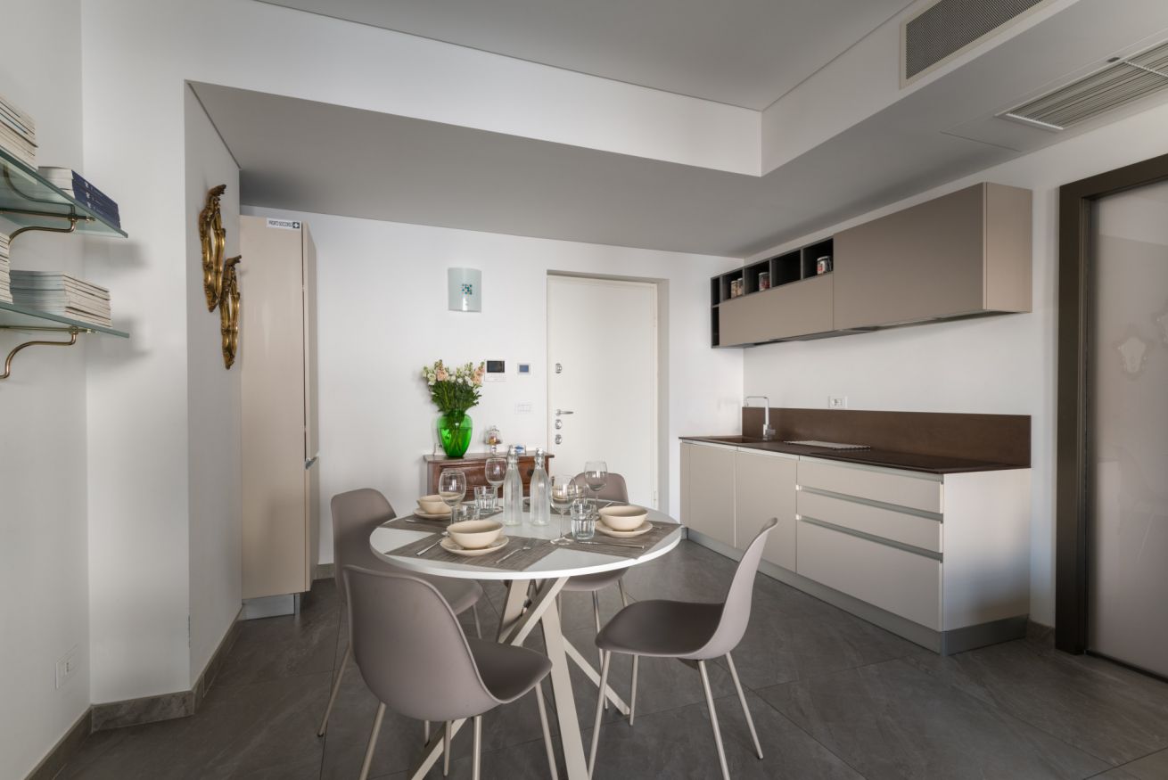 Dotata di armadio capiente, comodini e cassettiera. Ampio soggiorno con divano letto di una piazza e mezzo, televisione tavolo da pranzo. Angolo cottura di design, dotato di piastra ad induzione e lavastoviglie.
