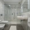 Un bagno con ampia doccia a raso, lavabo e bidet.
