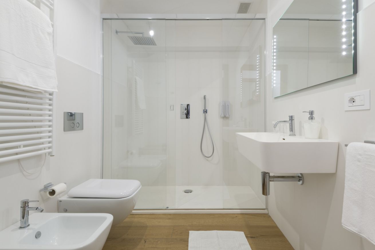 Un bagno con ampia doccia a raso, lavabo e bidet.