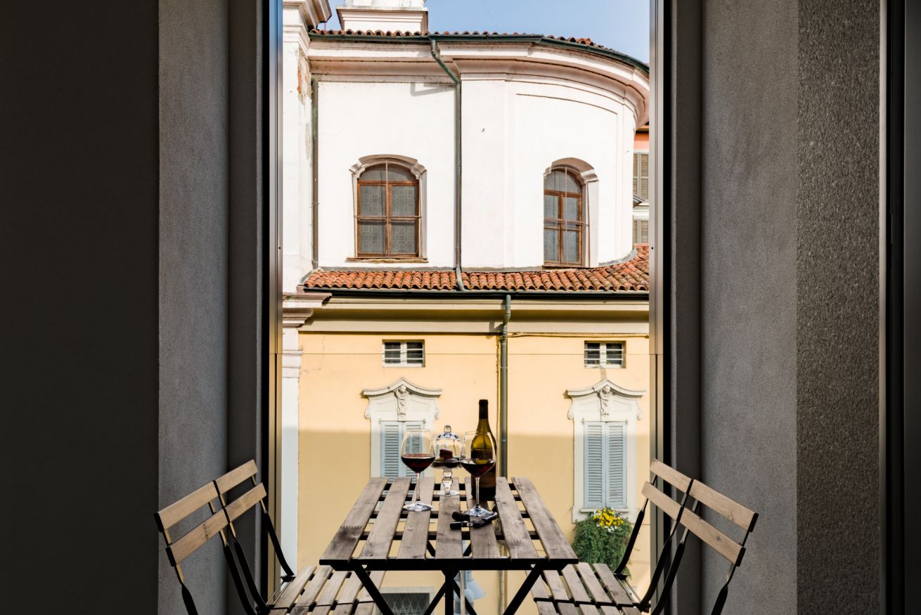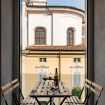 Terrazza con tavolo per 4 persone con affaccio sulla chiesa e sulla via principale del centro storico.